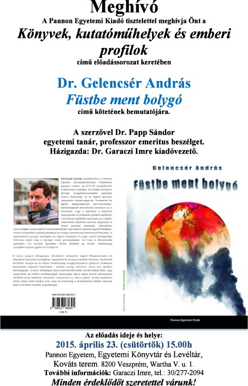 A Pannon Egyetemi Kiadó tisztelettel meghívja Önt Könyvek, kutatóműhelyek és emberi profilok című előadássorozata keretében Dr. Gelencsér András: Füstbe ment bolygó című kötetének bemutatójára.