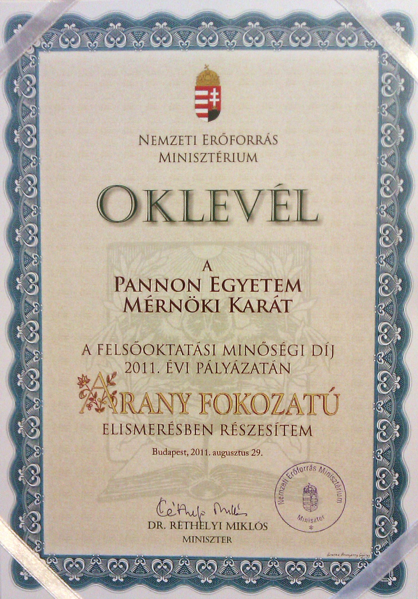 A 2011. évi Felsőoktatási Minőségi Díj pályázaton a Pannon Egyetem Mérnöki Kara arany fokozatú elismerő oklevélben részesült szervezeti egység kategóriában. Az elismerő oklevelet 2011. október 26-án ünnepélyes keretek között dr. Dux László a Nemzeti Erőforrás Minisztérium helyettes államtitkára adta át dr. Abonyi János oktatási és akkreditációs dékánhelyettesnek.