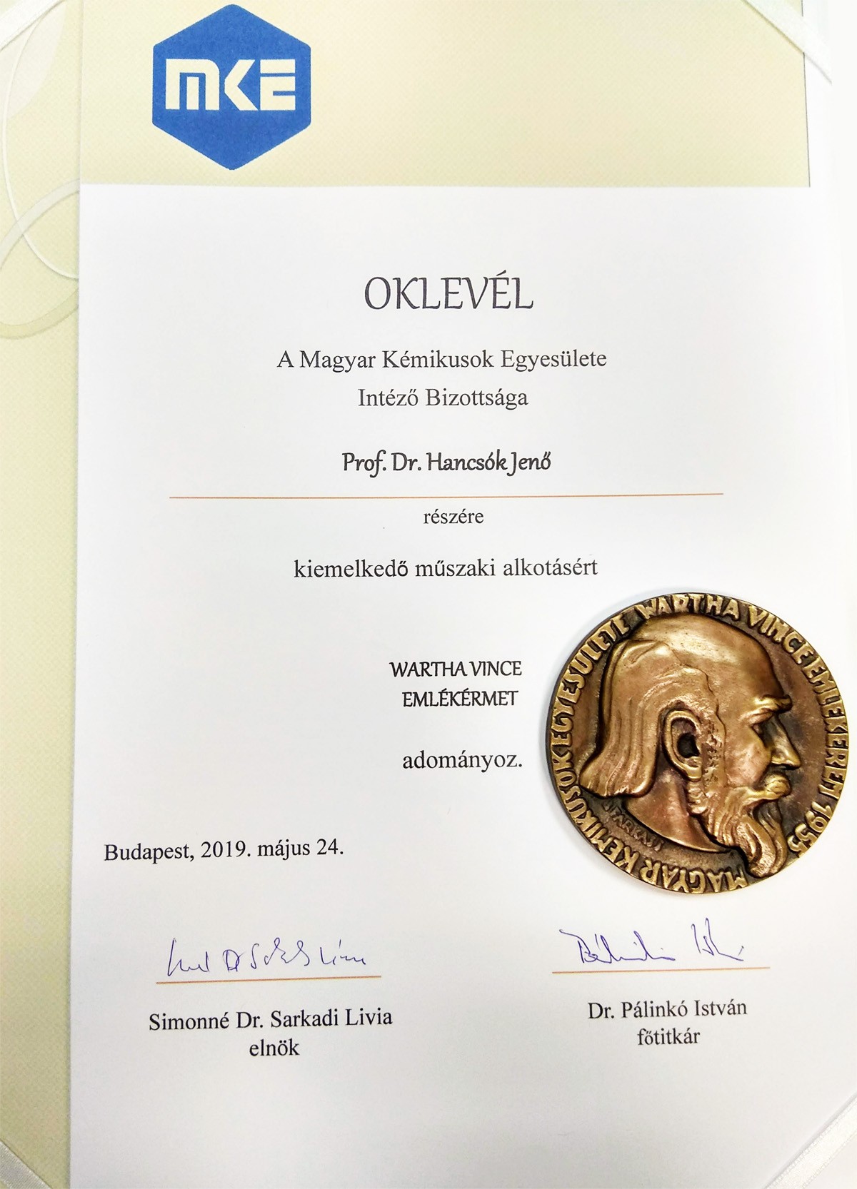 Hancsok Jeno Wartha Wince emlekeremA Magyar Kémikusok Egyesülete Intéző Bizottsága prof. dr. Hancsók Jenő részére, kiemelkedő munkásságáért Wartha Vince Emlékérmet adományozott 2019. május 24-én.